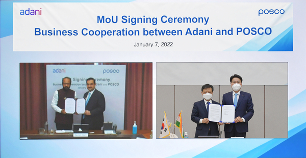 [기계신문] 포스코가 인도 아다니(Adani) 그룹과 친환경 일관제철소 등 합작사업을 추진한다. 양사는 지난 7일 포스코그룹 최정우 회장, 김학동 철강부문장(부회장) 및 아다니 가우탐(Gautam) 회장, 카란(Karan) 항만·물류사업 CEO 등이 참석한 가운데, 온라인으로 포괄적 협력 양해각서(MOU) 체결식을 개최했다.