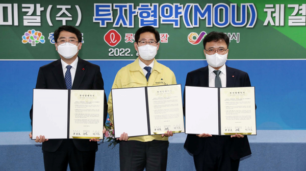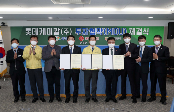 롯데케미칼은 7일(월) 충남도, 서산시와 황진구 롯데케미칼 기초소재사업 대표, 양승조 충남도지사, 맹정호 서산시장 등이 참석한 가운데 공장 신·증설에 관한 투자협약(MOU)을 체결했다.