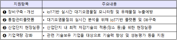 또한, ➌산업단지 내 오염물질 배출농도 측정결과를 토대로 관련 사업장의 배출농도 저감을 위한 현장실사 및 맞춤형 컨설팅을 지원하는 한편, ➍대기오염물질 저감기술 보유기업에 대해서는 자체 역량강화를 위해 기술력 향상·성능평가 등을 지원한다는 계획이다.