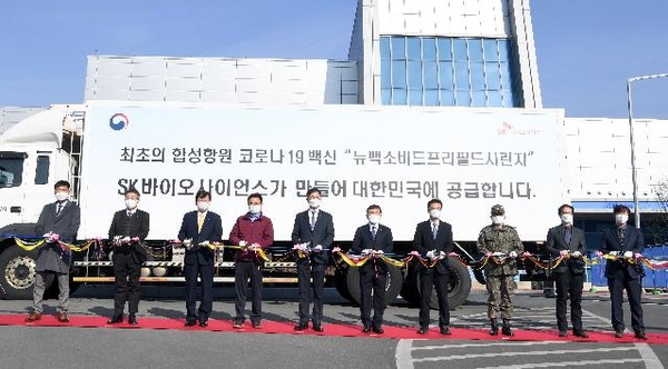 출하식에는 이철우 경북도지사, 김헌주 질병관리청 차장, 김영균 대구지방식약청장, 장상길 경북도 과학산업국장, SK바이오사이언스 안재용 대표, 김훈 CTO(최고기술책임자)등이 참석했다.