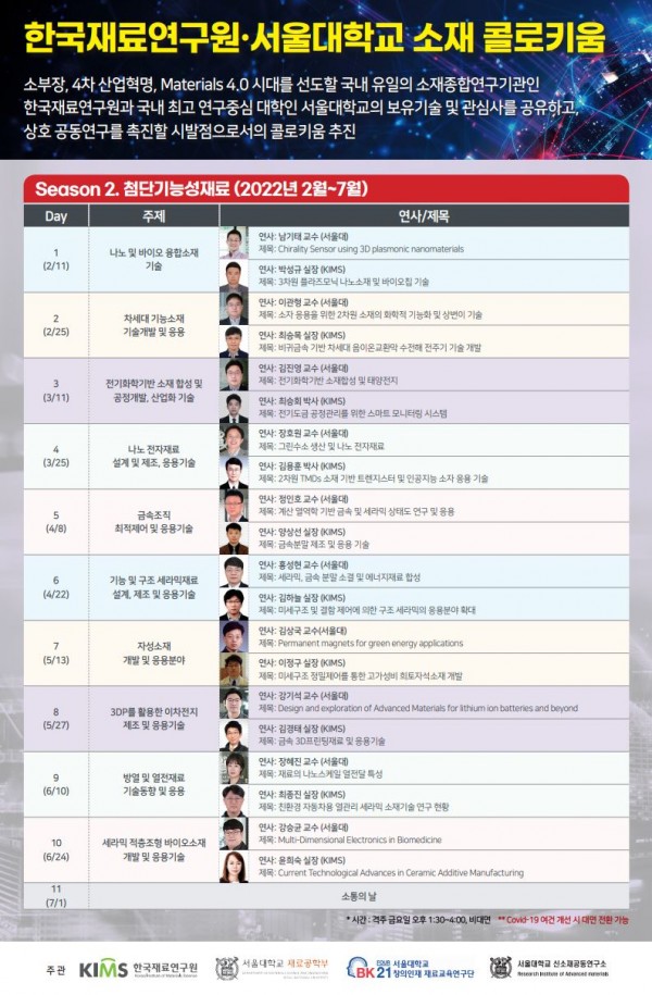 양 기관은 ‘나노 및 바이오 융합소재 기술’을 주제로, 서울대 남기태 교수와 재료연구원 박성규 실장이 2월 11일(금) 첫 번째 일정을 시작했다. 이번 ‘소재 콜로키엄’ 두 번째 시즌은 총 10회 개최 예정으로 6월 24일(금)까지 진행될 예정이다.