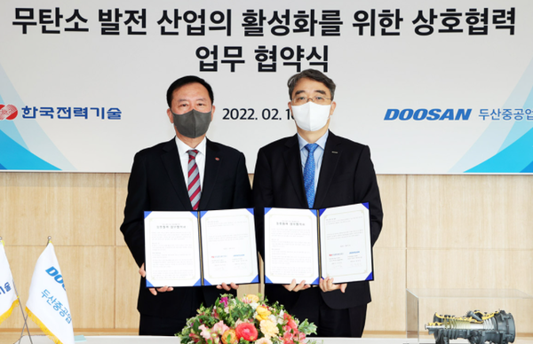 이번 협약을 통해 한국전력기술은 플랜트 최적화 등 전반적인 발전소 엔지니어링 기술을 개발하고, 두산중공업은 암모니아 개질 설비와 수소터빈 등 주기기 개발을 맡는다.