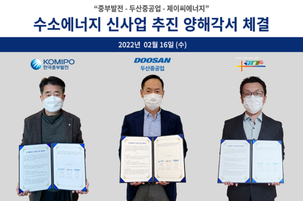 또, 두산중공업은 한국중부발전, 제이씨에너지와 ‘수소에너지 신사업 추진 협약’도 16일 체결했다. 이 협약은 ▶전남 영암군 대불국가산단 내 100MW 규모의 연료전지 발전사업 추진 ▶1,000MW 규모의 수소 혼소·전소 발전사업 개발을 위한 것으로, 비대면 체결식에는 한국중부발전 이호태 사업본부장, 두산중공업 박인원 Plant EPC BG장, 제이씨에너지 문감사 대표가 참석했다.