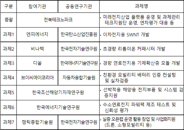 ‘기술사업화 협업 플랫폼 구축 지원 사업’은 지역혁신주체(전북테크노파크) 중심으로 미래전지 소재·부품산업 밸류체인 기반 기업 및 연구기관 등으로 협의체를 구성해 유망기술 발굴, R&BD 과제 검토 및 자문 등의 역할을 수행한다.