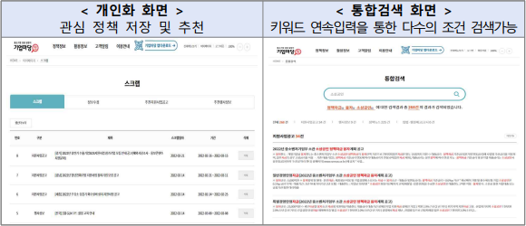 기업이 기업마당에서 필요한 정보를 검색하면 사업별 담당자가 사전에 부여한 다양한 핵심어표시(해쉬태그)에 따라 검색 결과가 표출된다. 아울러 기업인들이 최신 정책 경향를 쉽게 알 수 있도록 ’인기검색어‘도 초기화면 상단에 배치했다.