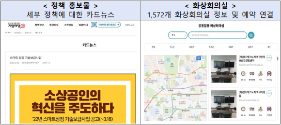 신규 서비스로 이번에 개설한 ‘정책 홍보물’ 메뉴를 활용하면 정책별 세부 내용을 쉽게 정리한 카드뉴스·영상을 접할 수 있고, 중소기업 관련 입법예고·행정예고·고시 등 법률 정보도 찾을 수 있다.