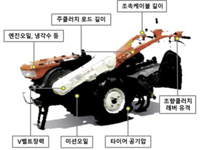 영농철에 사용되는 경운기, 트랙터, 이앙기 등 기종별 공통 점검·정비 사항을 보면, 우선 농기계에 쌓인 먼지, 흙을 털어내고 녹이 슨 부분은 기름을 칠한다. 엔진과 미션오일 등은 양과 상태를 점검해 보충하거나 교환한다.