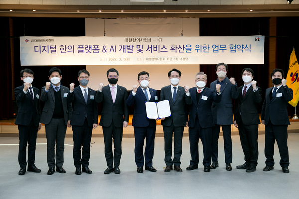 KT는 대한한의사협회와 지난 5일 서울시 강서구에 위치한 대한한의사협회 5층 대강당에서 ‘디지털 한의 플랫폼 & AI 개발 및 서비스 확산을 위한 업무협약’을 체결했다.