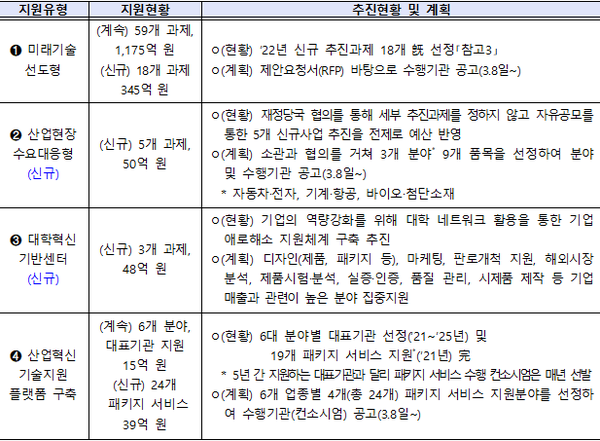 올해 사업은 ➊미래기술선도형(계속+신규), ➋산업현장 수요대응형(신규), ➌대학혁신기반센터(신규), ➍산업혁신기술지원플랫폼구축(계속+신규) 등 4개 유형으로 추진한다.