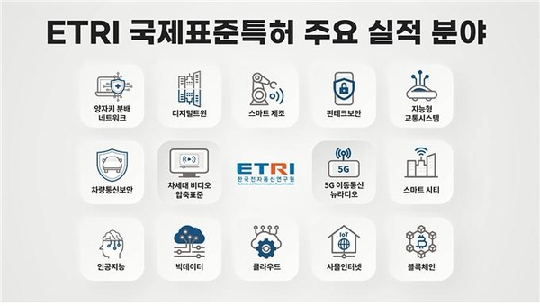 최근 ETRI가 확보한 국제표준특허에는 차세대 비디오 압축표준(VVC) 분야 64건과 5G 이동통신(NR) 분야 48건 등 시장 수요가 높은 상용표준특허가 다수 포함되어 향후 상당한 특허 기술료가 전망된다. 또한, 제4차 산업혁명의 핵심기술이라 일컬어지는 인공지능, 빅데이터, 클라우드 컴퓨팅, 사물인터넷, 블록체인 등의 기술도 다수 포함되어 있다.