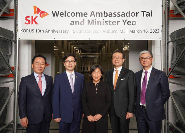 [기계신문] 17일 SK그룹에 따르면, 여한구 산업통산자원부 통상교섭본부장과 캐서린 타이(Katherine Tai) 미국 무역대표부(United States Trade Representative, 이하 USTR) 대표 등이 16일(현지 시각) 미국 미시간주 SK실트론 CSS 공장을 방문해 양국 경제·기술 협력 강화 방안 등을 논의했다.