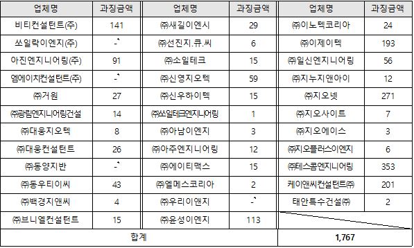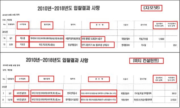 이들 36개사는 2010년 5월부터 2019년 5월까지 102건의 입찰에 참가하여 총 99건을 낙찰받았으며, 총 계약금액은 약 502억 원이다.
