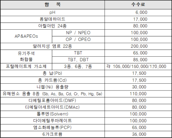 이 중 안전기준 준수 대상 제품은 기업당 최대 500만 원, 안전확인 대상 제품은 최대 200만 원 내에서 수수료를 지원할 예정이다. 지원되는 시험 항목은 폼알데하이드, 유기주석화합물, 아릴아민 24종, pH, 알러지성 염료 22종, 프탈레이트계 가소제, 납, 카드뮴, 유해 원소 용출 8종, 디메틸포름아미드 등이다.