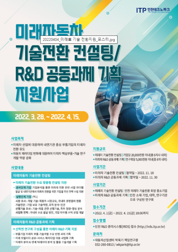 지원신청은 오는 15일까지 인천R&D관리시스템을 통해 접수하면 되고, 자세한 내용은 홈페이지를 참조하거나 인천TP 자동차산업센터로 문의하면 된다.