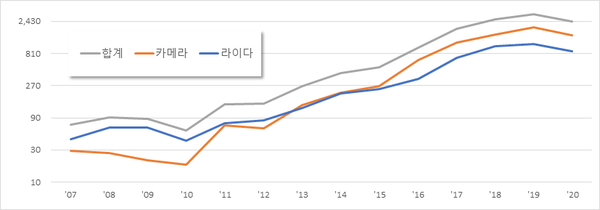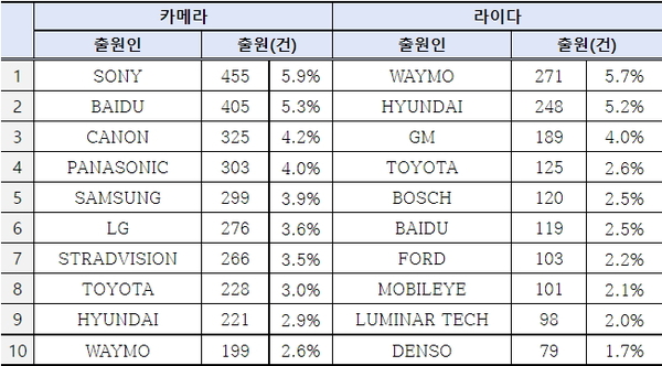 2013년 이전에는 라이다 분야 출원이 카메라 분야보다 많았지만, 이후 카메라 분야 출원이 라이다 분야를 앞질러 2020년 카메라 분야는 1,525건, 라이다 분야는 870건 출원되었다.