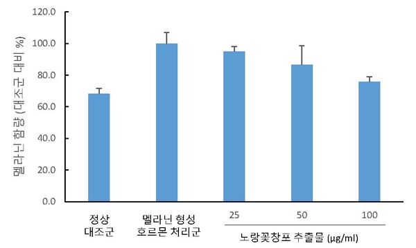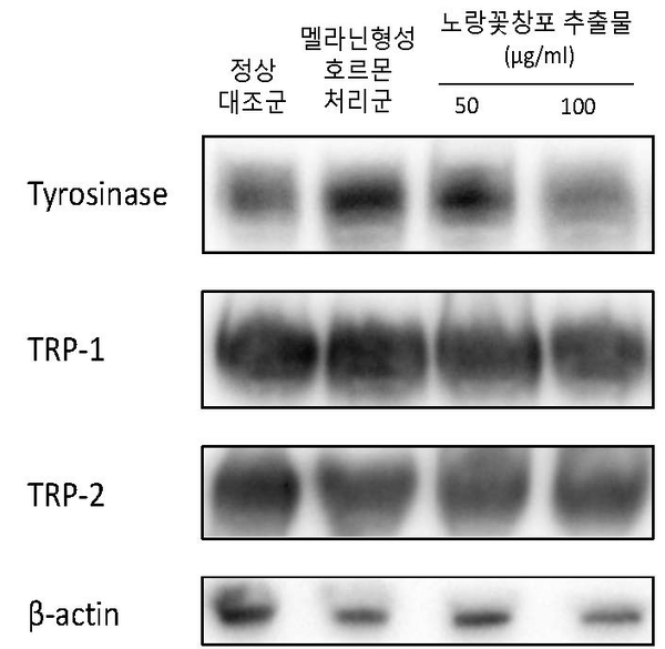 연구 결과, 멜라닌 형성 호르몬을 처리한 흑색종 세포에 노랑꽃창포 추출물(100μg/ml)을 처리한 실험군에서 처리하지 않은 대조군에 비해 멜라닌 형성이 24.2% 저해되는 것으로 나타났다. 노랑꽃창포 추출물은 세포 내의 멜라닌 합성에 관여하는 단백질인 티로시나아제의 발현을 감소시켜 멜라닌 합성을 억제한 것이다.