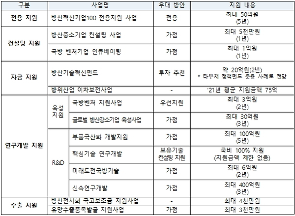 Full-package 지원책은 컨설팅, 연구개발, 수출지원 등 방위사업청 주요 방산육성 지원사업 참여 시의 우대 혜택과 선정기업만을 대상으로 하는 전용지원사업 등으로 구성되어 기업을 종합적·다면적으로 지원하게 된다.