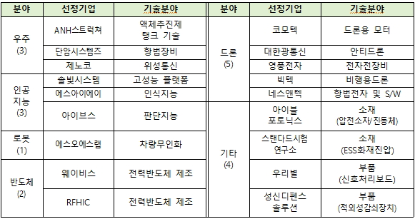 이번 1기 방산혁신기업에는 우주 발사체, 위성 등의 경량화를 통한 성능 향상 기술을 보유한 기업, 국방 분야 전력반도체의 효율화에 필요한 기반기술을 보유한 기업, 드론 핵심구성품에 대한 고유 기술을 보유한 기업 등 국방신산업 5대 분야에서 혁신역량을 보유한 14개 기업과 기타 핵심소재 및 부품 관련 기술을 보유하고 있는 4개 기업, 총 18개 기업이 선정되었다.