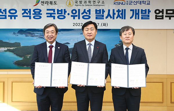 [기계신문] 전라북도는 지난 27일 김관영 전북도지사, 박종승 국방과학연구소장, 이장호 군산대학교 총장이 참석한 가운데 국산 탄소섬유를 활용한 위성발사체용 구조체 개발을 위한 업무협약을 체결했다고 밝혔다.