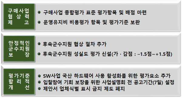 이와 함께 소프트웨어 개발사업인 전장관리정보체계 사업을 추진함에 있어 서버, 네트워크 등의 상용 국산 정보통신 장비의 사용을 권장하기 위해 ‘국산 상용 하드웨어 도입’을 평가요소로 추가하였다.