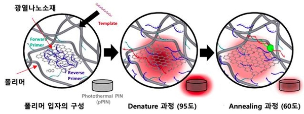 KIST 연구팀은 광열 나노소재의 불안정성을 극복하기 위해 광열 나노소재를 물리적으로 붙잡을 수 있는 고분자 복합체를 제작했고, 이를 PCR 구동장치에 적용해 열판이 없는 소형 PCR 구동장치를 개발에 성공했다.