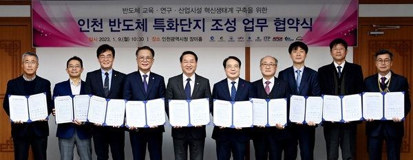 [기계신문] 인천광역시는 지난 9일 대학·연구기관·반도체 관련 협회 등 9개 기관과 함께 ‘인천 반도체 특화단지 조성 추진’ 공동 노력을 위한 업무협약을 체결했다.