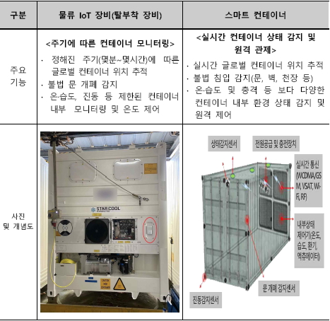 컨테이너 IoT 장비 보급 시범사업은 컨테이너의 외부에 IoT 장비를 설치하여 운송사가 컨테이너의 상태정보를 주기적으로 모니터링 할 수 있게 하는 사업으로, 2021년부터 2년간 총 4,160개를 국적선사에 보급하였다.