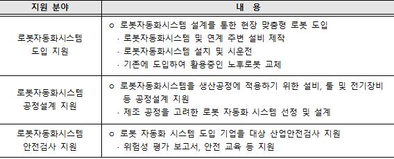 특히, 로봇 도입 전 로봇엔지니어링 컨설팅 서비스를 통해 공정자동화 설계 및 생산기술 개선을 지원하고, 도입 이후에도 이를 활용할 수 있도록 로봇제품 활용교육 및 안전검사까지 기업 수요에 맞게 종합적으로 지원한다.