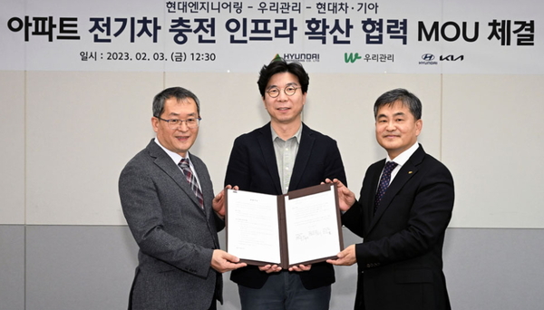 [기계신문] 현대자동차·기아는 지난 3일 서울 종로구 현대엔지니어링 계동사옥에서 현대엔지니어링, 우리관리와 함께 아파트 전기차 충전 인프라 확산을 위한 3자 MOU를 체결했다고 밝혔다.
