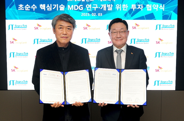 [기계신문] SK에코플랜트는 지난 3일 서울 종로구 수송사옥에서 분리막 제조 전문기업 ㈜세프라텍과 초순수(Ultra Pure Water) 핵심기술 연구개발 및 투자협약식을 체결했다. 협약식에는 김병권 SK에코플랜트 에코랩센터 대표와 염충균 ㈜세프라텍 대표 등 양사 관계자들이 참석했다.
