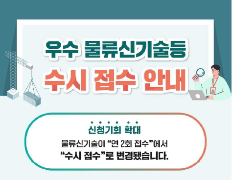 이번 ‘수시 접수’ 체계 도입에 따라 신청인이 공고기간 내 신청서류를 준비하지 못해 접수 시기를 놓치는 문제를 해결하고, 개발자가 원하는 시기에 신청할 수 있도록 하여 물류신기술 신청 문턱을 낮출 수 있게 됐다.