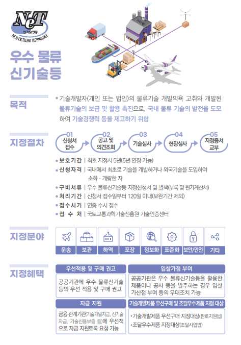 ‘우수 물류신기술’은 글로벌 물류산업 경쟁력 강화를 위해 물류분야에 활용되는 새로운 기술 개발을 촉진하고, 기술 개발자를 지원하기 위한 제도이다.