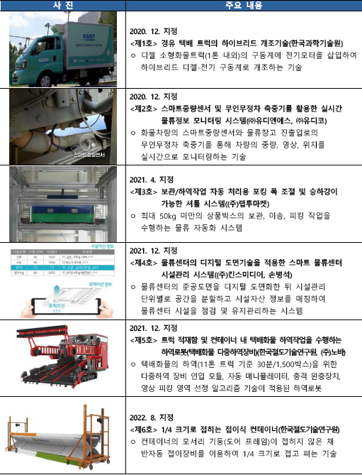 지난 2020년 첫 시행 이후 현재까지 6건의 물류신기술이 지정되었으며, 화물차량의 무게와 위치를 실시간으로 모니터링하는 기술, 1/4 크기로 접히는 컨테이너 등 물류산업 전반에 적용될 수 있는 다양한 물류기술이 우수성을 인정받았다.