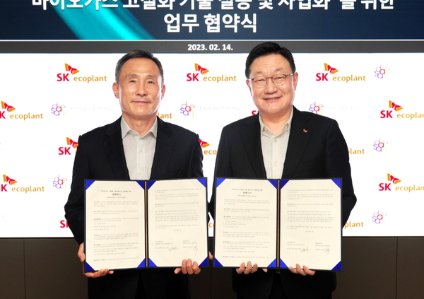 [기계신문] SK에코플랜트는 지난 14일 서울 종로구 수송동 본사에서 ㈜홍보에너지와 ‘바이오가스 고질화 기술 실증 및 사업화’를 위한 업무협약을 체결했다. 이날 협약식에는 김병권 SK에코플랜트 에코랩센터 대표와 박용주 ㈜홍보에너지 대표 등 양사 관계자들이 참석했다.