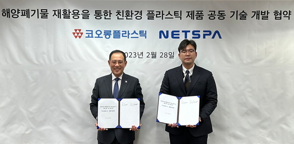 [기계신문] 코오롱플라스틱은 28일(화) 경기 과천시 코오롱타워에서 폐어망 전처리 기술을 통해 재생 나일론 원료를 생산하는 리사이클 소셜벤처 넷스파(Netspa)와 ‘해양폐기물 재활용을 통한 친환경 플라스틱 제품 공동 기술 개발 협약’을 체결했다.