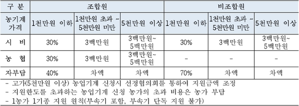 5,000만 원 미만 농업기계에 대해선 구입비용의 60%(서울시 30%, 농협 30%), 최대 600만 원까지 지원한다. 5,000만 원 이상 고가 기계는 최대 1,000만 원까지 지원하는데, 금액은 선정협의회에서 최종 결정한다. 지원금 외 차액은 신청 농가가 부담해야 한다.