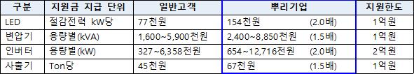 한국전력은 뿌리기업을 대상으로 4대 고효율기기(LED, 인버터, 변압기, 사출기) 교체지원금을 최대 2배까지 우대 지원한다. 올해는 지원예산을 기존 55억 원에서 220억 원으로 확대 편성하고, 대상품목도 기존 4개에서 9개로 확대 적용한다.
