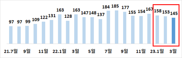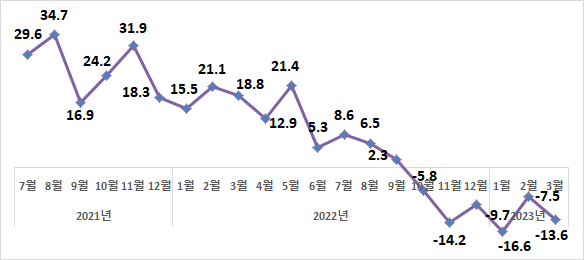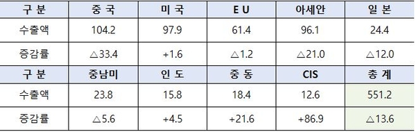2022년 3월 수출이 月 기준 역대 최고실적(637.9억 달러, +18.8%)을 기록한 데 따른 기저효과도 2023년 3월 수출 감소에 영향을 미쳤다. 수출규모는 2022년 9월(572억 달러) 이후 6개월 만에 550억 달러대를 회복했다.