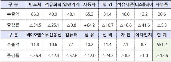 그 외 디스플레이(△41.6%)·컴퓨터(△57.6%) 등을 포함한 IT품목, 석유화학(△25.1%)·철강(△10.7%) 등 중간재 수출도 전년대비 감소했다.