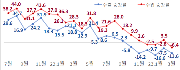 [기계신문] 산업통상자원부에 따르면, 올해 3월 수출은 전년동월보다 △13.6% 감소한 551.2억 달러, 수입은 △6.4% 감소한 597.5억 달러를 기록했으며, 무역수지는 △46.2억 달러 적자를 기록했다.