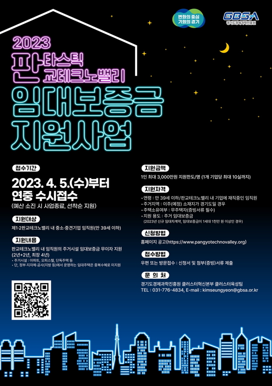 임대보증금 지원을 희망하는 판교테크노밸리 내 중소·중견기업 임직원은 판교테크노밸리 누리집 공고를 참고하거나 경기도경제과학진흥원 클러스터혁신본부 클러스터육성팀으로 문의하면 된다.