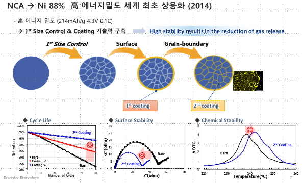 이차전지의 에너지밀도를 높이는데 가장 중요한 소재인 양극소재 중 고난이도 기술이 필요한 고함량 니켈이 들어가는 NCA 소재를 전구체부터 양극소재까지 모든 공정의 양산화에 성공한 것은 대한민국 전지 소재 산업에서 매우 중요한 성과다.