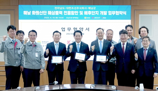 [기계신문] 전라남도가 10일(월) 해남군, 대한조선㈜과 ‘해남 화원산단 개발 협력 업무협약’을 맺고 국내 최대 해상풍력 배후단지 조성에 본격 나섰다.