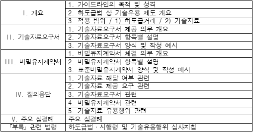 이에 공정위는 법 집행의 예측가능성을 높이고 사업자들의 법 위반행위를 예방하기 위해 하도급법 상 기술자료 보호 관련 가이드라인을 마련하였다.