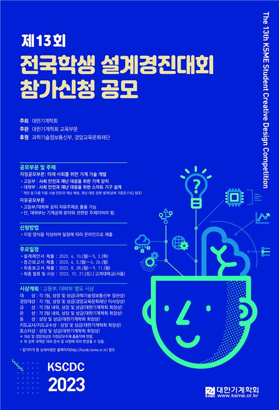 제안서 제출은 오는 5월 2일(화)까지이며, 제13회 전국학생설계경진대회 홈페이지를 통해 접수받는다. 제안서, 중간보고서, 최종보고서, 최종 발표 등의 심사를 거쳐 선정된 수상자들에게는 과학기술정보통신부 장관상, 경암교육문화재단 이사장상, 대한기계학회 회장상 등이 상금과 함께 수여된다.