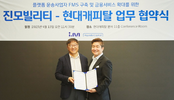 [기계신문] 현대캐피탈과 진모빌리티가 지난 13일(목) 플랫폼 운송사업자를 위한 ‘차량관리시스템(Fleet Management Solution, FMS)’ 구축과 금융서비스에 대한 업무협약(MOU)을 체결했다.