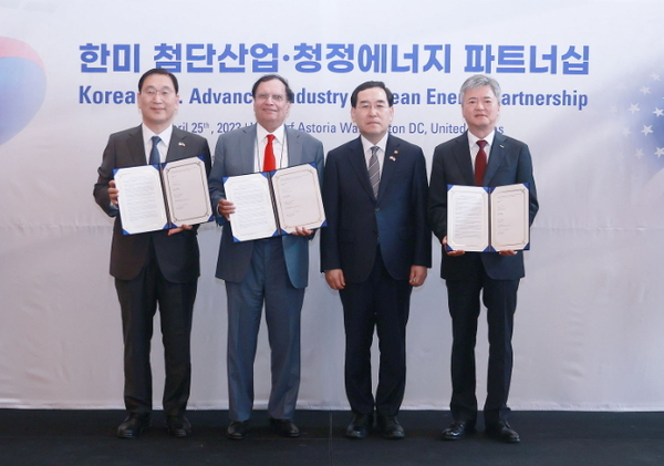이날 진행된 한미 기업 간 청정에너지 분야 MOU를 통해 현대건설 윤영준 사장과 홀텍 크리스 싱 대표는 한국무역보험공사 이인호 사장과 원전산업 협력 강화를 위한 3자간 업무협약을 맺었다.