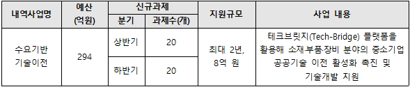 ‘테크브릿지 활용 상용화 기술개발사업’은 독자적 기술개발이 어려운 중소기업이 대학·연구기관 보유 핵심기술을 이전받아 사업화할 수 있도록 지원하는 대표적인 소재·부품·장비 분야 상용화 연구개발(R&D) 사업으로, 올해 예산은 293.64억 원이고 기업당 최대 2년 8억 원까지 R&D 자금을 지원한다.