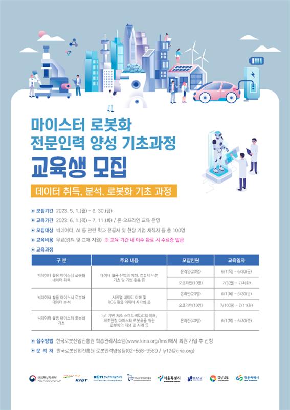 올해 기초과정 모집인원은 총 100명으로 수강 신청은 6월 30일까지 로봇산업진흥원 홈페이지를 통해 신청할 수 있다. 교육 과정은 전액 무료로 운영되며 하반기에는 금속가공 업종 분야 마이스터 전문인력 기술 지원을 위한 교육 과정이 개설될 예정이다.