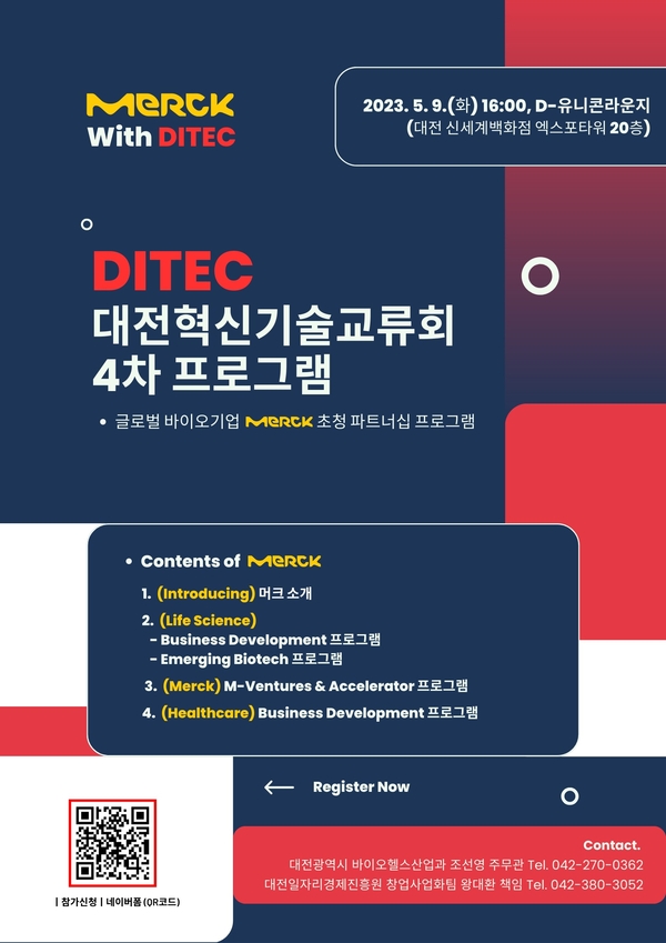 이번 행사는 매월 2, 4째 주 화요일에 열리는 ‘대전혁신기술교류회(DITEC)’와 연계되는 행사로 ▲대전시 바이오산업 육성전략 및 기업지원 소개 ▲머크 기업 및 글로벌 진출 전략을 위한 파트너십 프로그램 소개(엑셀러레이터, M-벤처, 비즈니스디벨롭먼트 및 이머징 바이오텍 프로그램) ▲기업 질의응답 ▲만찬 및 네트워킹 행사 등으로 진행될 예정이다.